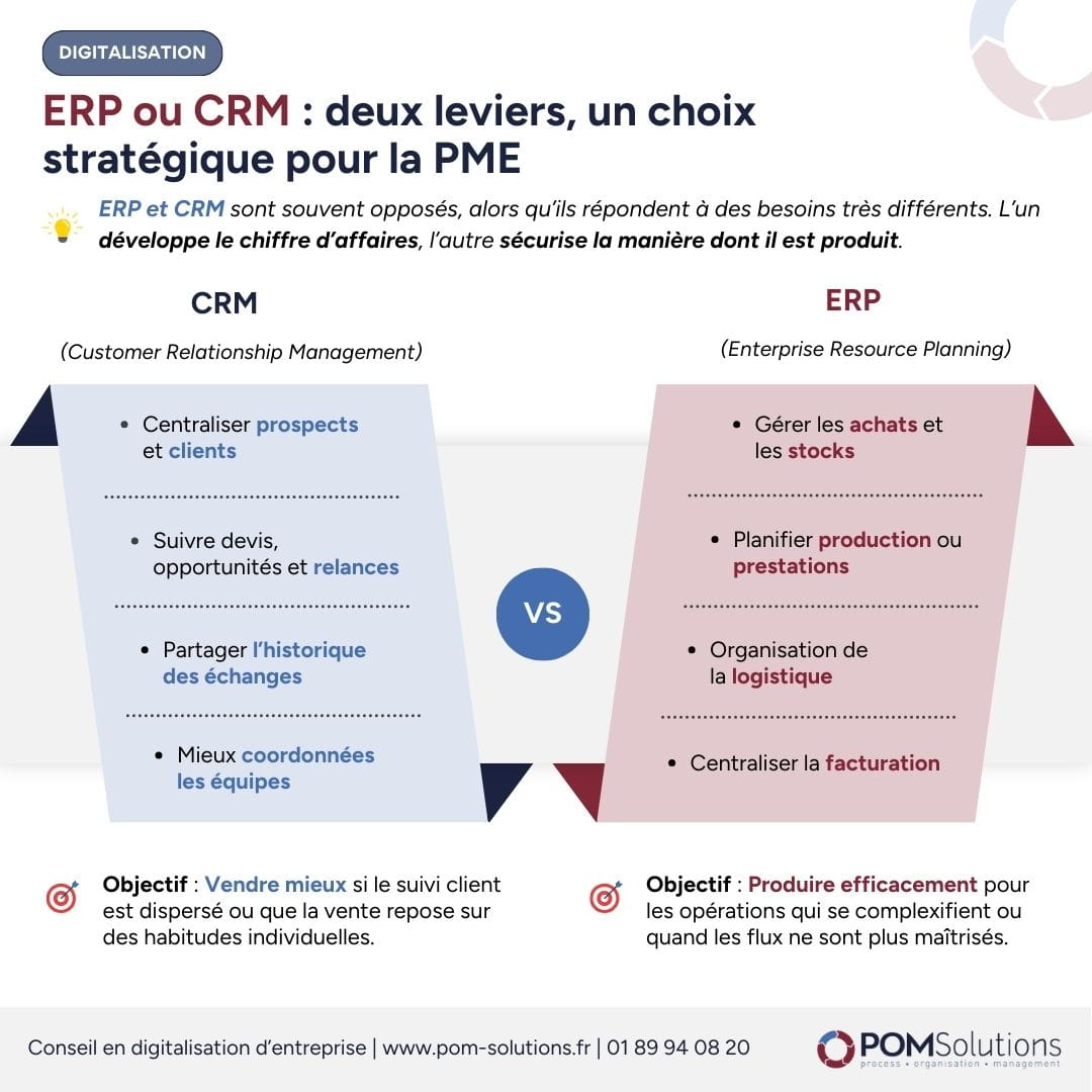 Le CRM couvre la relation client : prospection, devis, relances, fidélisation et pilotage commercial. L’ERP couvre l’exécution : production, planification, achats, stocks, facturation et suivi des coûts.